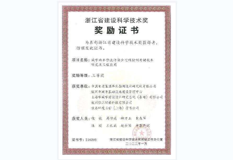 銀江環保《城市雨水徑流污染全過程控制關鍵技術研究及工程應用》獲浙江省建設科學技術三等獎。