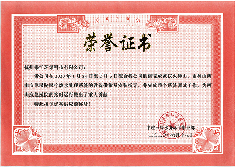 建黨99周年、銀江環保成立15周年之際,收到了中建三局頒發的感謝我司參建火神山、雷神山醫院的榮譽證書和感謝信!