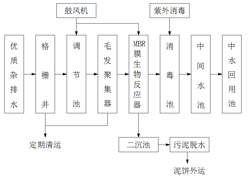 本項目為商業中心中水回用項目,回用水用于沖廁。中水的來源為洗滌,沐浴,廚房等優質雜排水,根據進水水質分析,優質雜排水可生化性好,宜采用生化處理。同時,因業主提供的處理設備安放場地有限,因此可選擇占地面積較小的生化處理結合膜生物反應器工藝,故確定處理工藝為:格柵→調節池→生化處理→膜處理→消毒→回用。