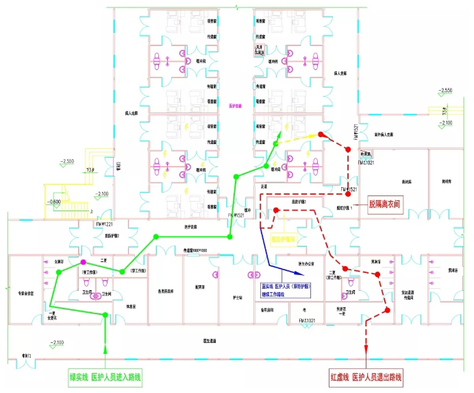 火神山醫(yī)院醫(yī)療設(shè)施按傳染病醫(yī)療流程進(jìn)行布局,且根據(jù)新型冠狀病毒感染的肺炎傳染病治療流程進(jìn)一步細(xì)化功能分區(qū)。基本分區(qū)為清潔區(qū)、限制區(qū)(半清潔區(qū))、隔離區(qū)(半污染區(qū)和污染區(qū)),相鄰區(qū)域之間設(shè)置相應(yīng)的衛(wèi)生通過或緩沖間。醫(yī)護(hù)人員進(jìn)入及退出流線如圖3所示。