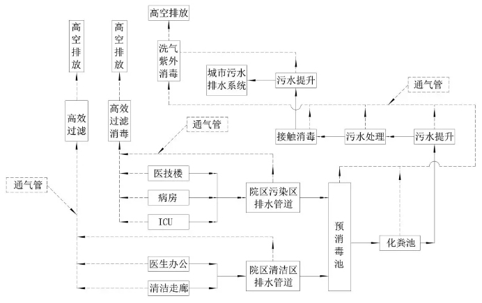 室外生活排水與雨水排水系統(tǒng)采用分流制,污染區(qū)的污廢水與清潔區(qū)污廢水分流排放,如病房、醫(yī)技和ICU等與辦公區(qū)、清潔走廊等衛(wèi)生器具和裝置的污廢水與排水通氣系統(tǒng)均獨(dú)立設(shè)置,且污廢水各自獨(dú)立排放至預(yù)消毒池。為此,首先需要根據(jù)醫(yī)療設(shè)施建筑功能分區(qū)、醫(yī)療流程布局對(duì)清潔區(qū)與污染區(qū)進(jìn)行清楚地劃分,限制區(qū)污廢水可排入清潔區(qū)排水系統(tǒng)。