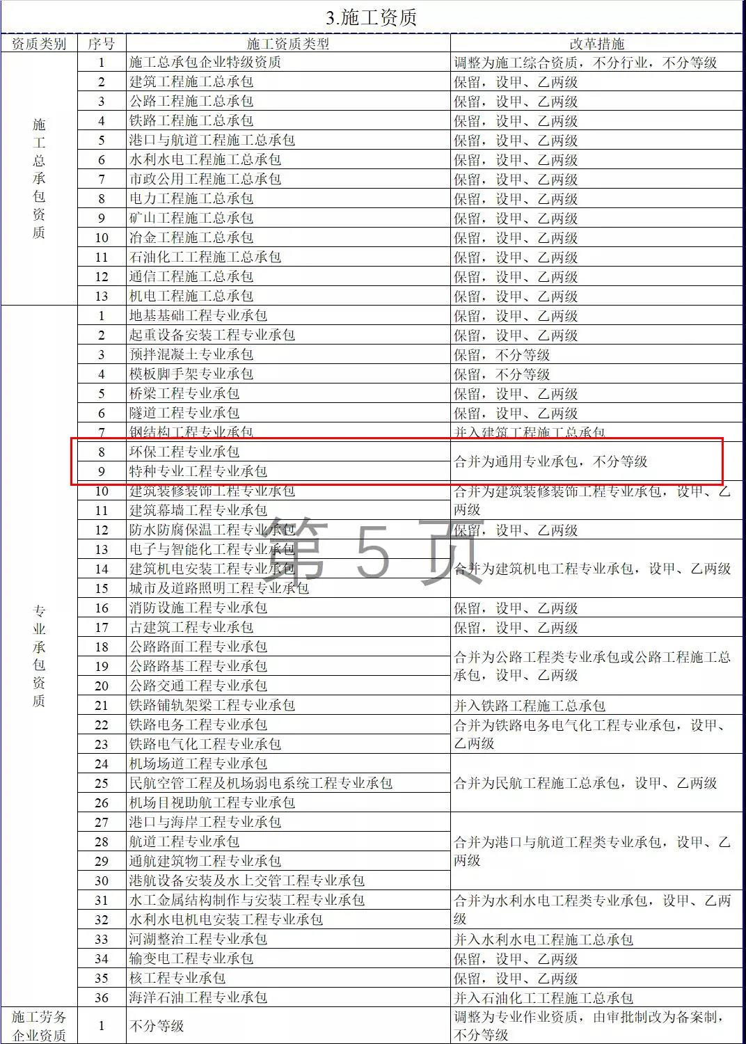 3.施工資質。將10類施工總承包企業特級資質調整為施工綜合資質,可承擔各行業、各等級施工總承包業務;保留12類施工總承包資質,將民航工程的專業承包資質整合為施工總承包資質;將36類專業承包資質整合為18類;將施工勞務企業資質改為專業作業資質,由審批制改為備案制。綜合資質和專業作業資質不分等級;施工總承包資質、專業承包資質等級原則上壓減為甲、乙兩級(部分專業承包資質不分等級),其中,施工總承包甲級資質在本行業內承攬業務規模不受限制。