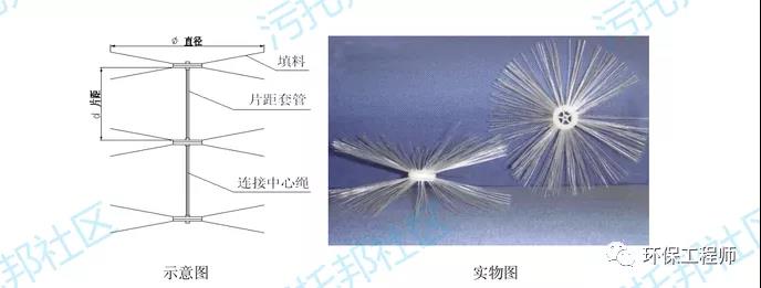 3. 彈性填料比半軟性填料更富剛?cè)岵⒓?,其?1 代結(jié)構(gòu)呈瓶刷狀(見下圖 3);其第 2 代呈片狀,且剖面呈 X 形燕尾狀,彈性絲隨中心扣周邊放射(見下圖 4),該填料具有更大的空隙率、更高的氣泡切割能力;可提高氧利用率,是一種節(jié)能型的彈性立體填料。規(guī)格如表 3、4。