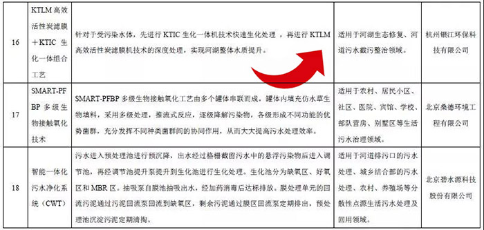技術目錄顯示,來自北控水務的城鎮排水系統智慧運營管控平臺,北排集團城市污水好氧高密度微生物顆粒技術和基于厭氧氨氧化功能菌群優化的污水處理新技術,桑德環境的SMART-PFBP 多級生物接觸氧化技術,碧水源的“MBR-DF”雙膜技術和智能一體化污水凈化系統(CWT),銀江環保的KtLM+KtIC一體化組合工藝等21項水污染防治技術位列其中。