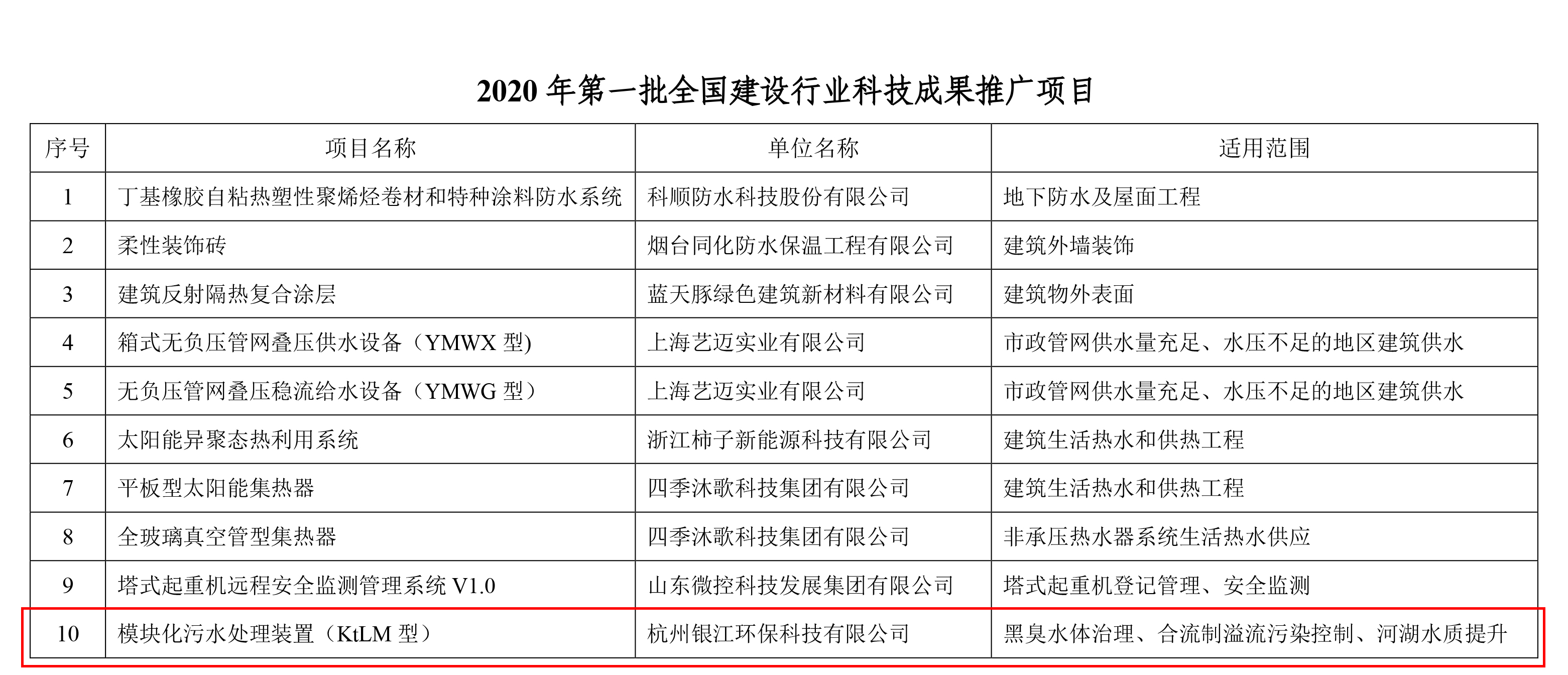 祝賀銀江環保“模塊化污水處理裝置(KtLM型)”入選2020年第一批全國建設行業科技成果推廣項目。
