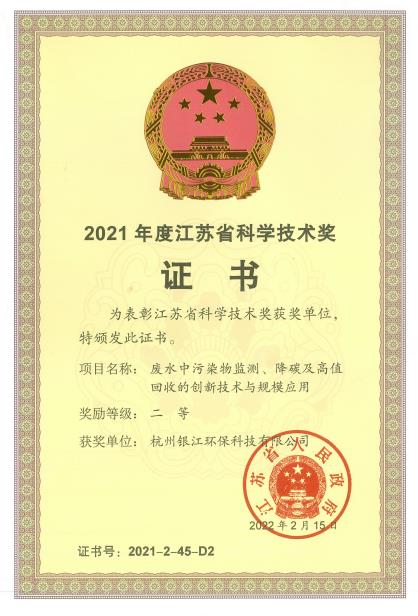 銀江環(huán)保《廢水中污染物監(jiān)測、降碳及高值回收的創(chuàng)新技術(shù)與規(guī)模應(yīng)用》獲2021年度江蘇省科學(xué)技術(shù)獎二等獎。