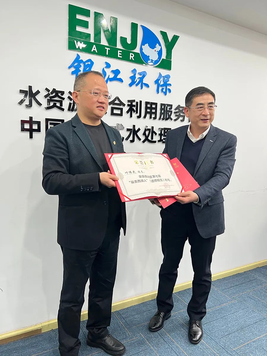 1月13日上午,西湖區領導走訪銀江環保,區委副書記陸志敏為董事長葉偉武頒發西湖區第七屆“最美西湖人”(道德模范)稱號榮譽證書。
